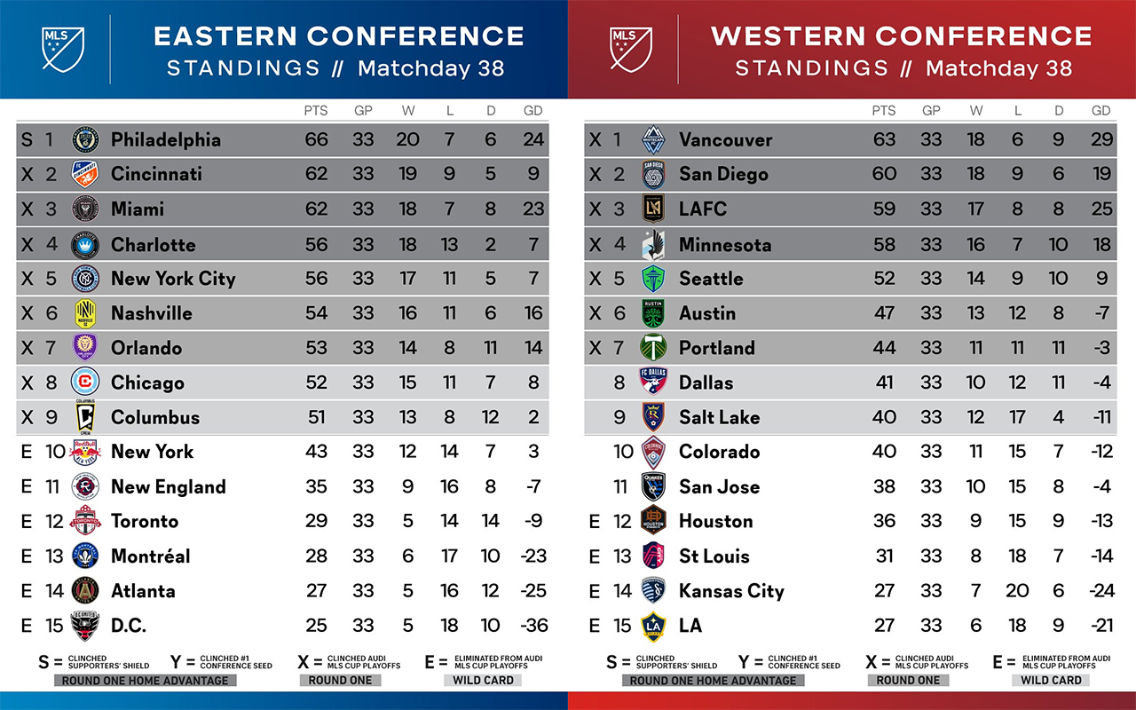 L’Union n’avait besoin que d’une victoire pour remporter le Supporters’ Shield, à savoir le trophée de la saison régulière de MLS. Chose faite face à New York City (1-0) et première saison réussie pour Bradley Carnell, qui avait déjà remporté la conférence Ouest lors de la première saison de St.Louis en MLS. L’Inter Miami de Lionel Messi ne pouvant plus rattraper Philadelphie, il doit désormais se focaliser sur le meilleur classement possible. Pour cela, il faudra éviter les déconvenues comme la défaite à la maison face à un Chicago qui termine la phase régulière en trombe (3-5) et peut rêver de top 7, et poursuivre les larges victoires comme face à New England (4-1) puis Atlanta (4-0). Autre enjeu pour les Hérons, permettre à Lionel Messi de remporter le titre de meilleur buteur, son doublé face à Atlanta lui permettant d’aborder Decision Day avec deux longueurs d’avance sur Denis Bouanga.