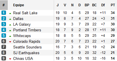 A l’Ouest, le scénario est quasi-identique. Accrochés ce week-end, les Royals ne profitent pas de la défaite de Dallas pour s’échapper. Pire, ils voient ainsi le Galaxy se rapprocher, revenant au passage sur des Timbers battus à Columbus. Là aussi tout reste possible, San José, actuel avant-dernier de conférence n’étant qu’à huit points de la dernière place qualificative pour les play-offs.