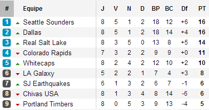 A l’Est, la semaine 8 n’aura pas été des plus prolifiques pour les leaders. Columbus est accroché chez lui par New York et son buteur du moment Bradley Wright-Phillips (oui, le fils de ou le frère de si vous préférez), auteur de 4 buts ce week-end (1 à Columbus, 3 lors du carton des Red Bulls à domicile face à Houston 4-0). Ce nul suffit pourtant au bonheur du Crew qui profite de la défaite du Sporting à New England. Mauvaise semaine pour le SKC, symbolisée par l’exclusion d’Aurélien Collin à l’entrée du dernier quart d’heure suivie de deux buts encaissés dans les derniers instants du match. Reste enfin à signaler la première victoire de la saison de l’Impact chez lui face à Philadelphie. Si le court succès décroché est encore loin de rassurer les fans de l’Impact, il leur permet cependant d’enfin croire au lancement de la saison. Reste à le prouver lors du prochain match dans quinze jours face au champion sortant.