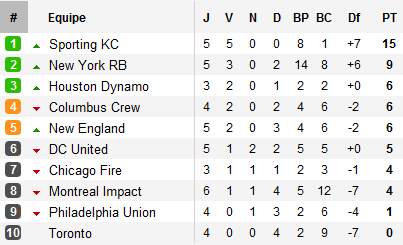 Car la caractéristique principale de la conférence Est reste le peu de points inscrits par ses membres. Pourtant les deux clubs qui dominent les dernières semaines de la MLS sont à l’Est. Le Sporting Kansas s’offre un 5/5 en dominant un Galaxy en pleine débâcle privé, pour des raisons encore obscures de David Beckham, et dont le collectif semble s’effriter au fil des sorties. Autre équipe du moment, les Red Bulls surfent sur les cartons avec un inattendu duo Kenny Cooper – Thierry Henry comme force de frappe de New York (13 des 14 buts inscrits par le club) et atomisent Columbus (4-1). Ces deux équipes dominent l’Est, Kansas comptant six points d’avance sur son dauphin new-yorkais, Houston pouvant se mêler au duo en cas de double succès dans les deux matchs de retard qui lui reste à disputer.