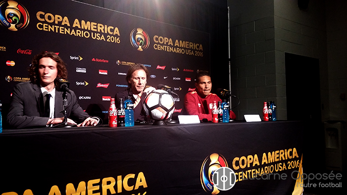 C’était alors l’heure de l’arrivée du groupe péruvien, Ricardo Gareca et Paolo Guerrero se sont présentés en conférence de presse. Interrogé sur l’état d’esprit général à la veille d’entrer dans la compétition, le technicien argentin a ainsi déclaré : « A la veille de débuter, il y a un peu de nervosité, nous nous sommes très bien préparés pour cette Copa, j’espère que nous parviendrons à faire du bon travail. Le groupe est, comme avant tout début, plein d’espoir. » Troisième des deux dernières éditions, le Pérou se retrouve devant un énorme défi, celui d’assurer un parcours similaire. Mais Gareca reste prudent : « On a effectivement fait une bonne dernière Copa América. On a de nouveaux joueurs ici, on a des attentes en ce sens mais il faudra être patient. Plus que jamais, il faudra y aller par étape. »