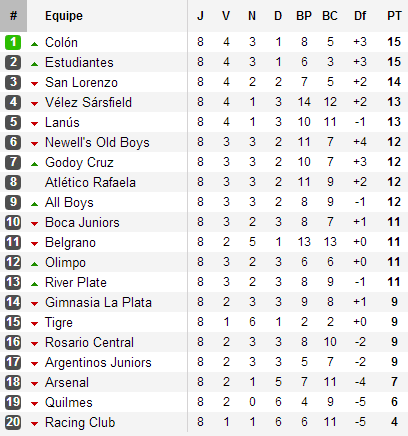 Dans la roue du Sabalero, l’autre surprise se nomme Estudiantes. Vainqueur du grand Clásico Platense, les Pinchas de Veron recollent au leader et mènent ainsi la poursuite devant les favoris du championnat, dans l’ordre, le champion sortant San Lorenzo, qui découvre les matchs nuls depuis 2 journées, Vélez, qui malgré le fait d’avoir fait tourné en Libertadores est écrasé par Rafaela en ouverture de la huitième journée, Lanús, qui a enfin mis la machine en marche, enchainant quatre victoires lors des cinq derniers matchs et enfin Newell’s qui s’offre 3 victoires sur les 5 derniers matchs, la dernière face au Racing avec le premier but d’un gamin de 16 ans Ezequiel Ponce et une merveille signée du Roi David.