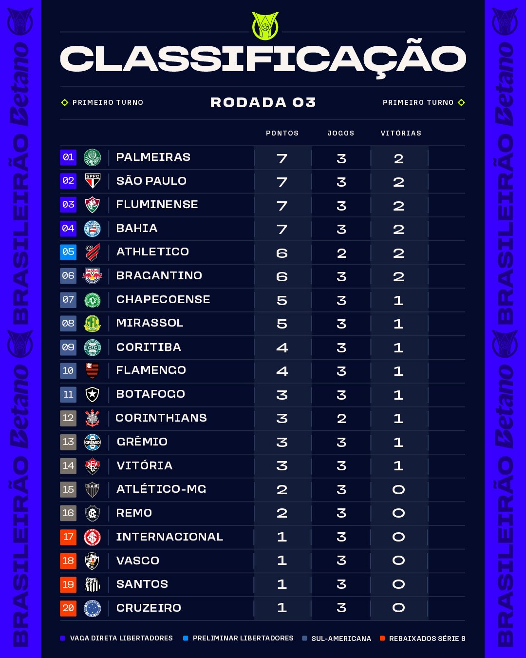 En ouverture de la troisième journée, Flamengo est toujours à la recherche d’un premier succès dans ce Brasileirão. Mission accomplie sur le terrain de Vitória, notamment grâce à un but et une passe décisive d’Everton Cebolinha et un penalty arrêté par Rossi. Le tenant du titre remonte en première partie de tableau alors qu’un autre favori au titre n’y arrive toujours pas. Après deux défaites inaugurales, Cruzeiro ne fait pas mieux qu’un match nul sur le terrain de Mirassol, l’artilheiro du dernier Brasileirão, Kaio Jorge, sauvant les siens sur penalty en fin de match.