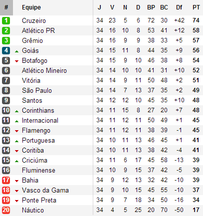 Ce n’était qu’une question de temps, c’est désormais officiel. Après le titre de 1966 et son format coupe, après le marathon de 2003 (46 journées), Cruzeiro décroche le troisième titre de son histoire en s’imposant à Vitória pour le compte de la 34e journée. S’il est un peu tôt pour dresser le bilan de la saison brésilienne, le sacre du Tricampeão à quatre journées de la fin conclus une saison largement dominée par les hommes de Marcelo Oliveria (27 fois leader sur 38 journées !), symbolisé par les 16 points d’avance sur le second.