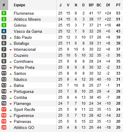 Il fallait y voir un signe. En ouverture de la 25e journée, Fluminense accueillait l’Atlético Goianiense, lanterne rouge avec trois petites victoires en 24 rencontres et, malgré l’absence de Fred, allait en profiter pour mettre la pression sur l’Atlético Mineiro. C’était évident. Tellement qu’en une mi-temps, le Flu est tombé. Deux buts signés Diego Garetta et Reniê permettent au Dragão de prendre 3 points à la surprise générale. Restait donc au Galo à en profiter. Mais sur le terrain du Náutico, modeste quatorzième, les coéquipiers de Ronaldinho se sont également inclinés, ratant l’occasion de reprendre la tête.