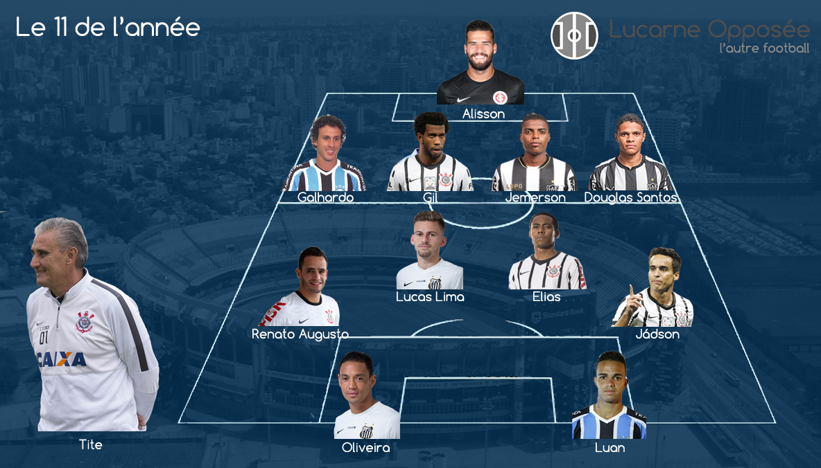 Il est toujours difficile d'établir un onze de l'année, et cela commence dès le choix du gardien. Si Cássio ou Marcelo Grohe auraient pu être choisis, mais on a préféré Alisson, le gardien de l'Internacional. À 23 ans, le gardien colorado a fait parler sa taille (1m93) et son jeu au pied pour s'imposer dans les buts de la Seleção. Transféré à la Roma, il rejoindra l’Italie en juin prochain. À droite, on a préféré Rafael Galhardo à Marcos Rocha, légèrement moins performant cette année. Prêté par Santos au Grêmio en 2015, Rafael Galhardo renforcera l'effectif santista la saison prochaine. En arrière gauche, Douglas Santos a été le plus régulier, même si le vétéran Zé Roberto mérite une mention, alors que la charnière centrale est composée de Gil et Jemerson. Au contraire de la sélection de Placar et de la CBF, on a préféré Lucas Lima, la star de Santos, à Rafael Carioca pour évoluer aux côtés d'Elias. On retrouve ensuite deux joueurs du Corinthians, Jadson (13 buts et 12 passes décisives dans le championnat brésilien) et Renato Augusto, dépositaire du jeu du Timão tout au long de l'année. Devant, Ricardo Oliveira a vécu à 35 ans l'une de ses plus belles saisons. Le pasteur a été élu meilleur buteur du championnat Paulista et du Brasileirão. Il forme un duo en attaque avec Luan, la pépite du Grêmio. À 22 ans, le joueur qui a découvert le foot à onze à seulement 19 ans, a été l'une des grandes révélations du championnat brésilien. Ancien joueur de futsal, rapide et dribbleur, il a terminé le championnat avec 10 buts et 7 passes décisives et semble encore pouvoir progresser. Cette nomination dans notre équipe-type laisse de côté le buteur argentin de l'Atlético-MG, Lucas Pratto. Comme entraîneur, Tite, le coach du Corinthians et favori de la presse et des supporters en cas de départ de Dunga, s'impose comme une évidence.