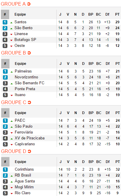 L'affiche de la journée était sans conteste le Derby Paulista, entre Palmeiras et Corinthians. Les joueurs des deux équipes entraient ensemble sur le terrain et se mélangeaient lors de la présentation afin de protester contre un autre mal qui ronge le football brésilien : la violence de ses supporters. Plusieurs bagarres ont eu lieu à São Paulo entre des fans des deux équipes et une personne, qui n'avait rien à voir avec le conflit, est décédée après avoir pris une balle perdue dans la poitrine. Sur le terrain, Palmeiras cherchait à reprendre confiance et à se rapprocher de la qualification. Les débuts de Cuca ont été très compliqués avec quatre défaites lors des quatre premiers matchs avant une victoire Rio Claro. Le Verdão a souffert et a concédé un penalty en seconde période. Fernando Prass repoussait la tentative de Lucca et deux minutes plus tard, Dudu marquait le seul but du match. Ce succès permet au Palmeiras de reprendre la tête du classement dans un groupe extrêmement serré. Pour preuve, Ituano est passé, après sa défaite à domicile, de la première à la dernière place. Les cinq équipes se tiennent en seulement deux points et Palmeiras tentera d'assurer sa qualification lors de la dernière journée contre Mogi Morim.