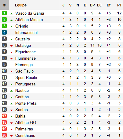Si les grands favoris sont absents en début de saison, ils laissent place aux outsiders annoncés en début de saison. Cruzeiro, toujours invaincu, enchaîne un second succès consécutif grâce à Wellington Paulista et pointe en cinquième position alors que devant Vasco et l’Atlético Mineiro s’envolent. Le Vascão de Juninho (qui vient d’annoncer qu’il prolongeait l’aventure de six mois) s’impose à Bahia et poursuit son sans-faute (4 victoires en 4 matchs), planant sur la Serie A. Reste que dans son sillage, la surprise annoncée par L-O en début de saison tient son rang. L’Atlético Mineiro s’offre Ronaldinho, l’aligne pour la première fois de la saison à Palmeiras et s’impose grâce à Jô, plongeant le Verdão dans les profondeurs du classement avec les Corinthians et s’accrochant à deux longueurs de Vasco.