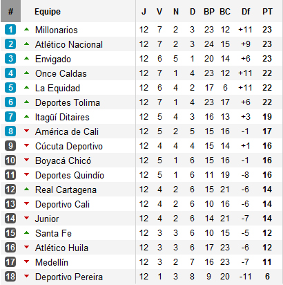 1 point. Voilà l’écart qui sépare le nouveau leader Millonarios du Deportes Tolima sixième après 12 journées. Ainsi, après avoir subit la domination d’Once Caldas, le tournoi d’ouverture de la Liga Postobon 2011 ne sait plus qui choisir. Nouveau leader donc, Millonarios qui, pourtant réduit à 9 avant la pause et mené au score, s’impose sur le terrain du Deportivo Pereira et profite du nul entre Tolima et Itagüí Ditaires. Mais Millonarios n’est pas seul en tête puisqu’il partage la première place avec l’Atlético Nacional, son prochain adversaire, qui s’impose devant le Deportivo Cali, et Envigado qui dispose de Boyacá Chicó, comptent aussi 23 points. Une équipe manque l’opportunité laissé par Tolima : Once Caldas s’incline pour la quatrième fois consécutivement sur le terrain de l’América Cali malgré le huitième but de Wason Rentería.