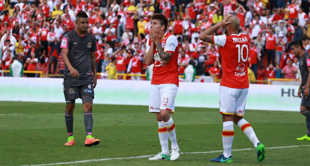 On se demandait jusqu’où Santa Fe pouvait aller sans trébucher. Ils ont perdu leurs premiers points de la saison peut être au moment où on s'y attendait le moins. Face à un promu qui lutte pour ne pas descendre, l'équipe cardinale est tombée dans le piège. La faute notamment à un manque de réalisme flagrant. Sans Wilson Morelo, c'est John Pajoy qui était en charge de l'attaque. Il s'est beaucoup démené, a été à l'origine des actions de son équipe mais sans réussite. C'est certainement ce qui a coûté la victoire de son équipe. Comme sur cette action à dix minutes de la fin où son centre a trouvé Sebastián Salazar mais le milieu de terrain n'a trouvé que la transversale. Avec 3 occasions nettes, los leones devaient faire mieux. C'est assez inquiétant de voir que le vainqueur de la Sudamericana en 2015 ne possède dans ses rangs qu'un seul vrai buteur. Impression confirmée par la suite. En déplacement à Tunja pour affronter Patriotas, le club cardinal n'a jamais trouvé la faille. Face au Deportivo Cali, la solution est venue du milieu de terrain puisque c'est Baldomero Peralza qui a ouvert le score. Il faut espérer pour Grégorio Pérez que le premier but du semestre d'Anderson Plata en deuxième période lui donnera la confiance nécessaire pour redevenir la machine qu'il était lors du deuxième semestre 2015. Pour faire tomber le vainqueur de la Sudamericana 2015, Tigres a joué de la même manière que ce qu'il produit depuis sa défaite à domicile contre Patriotas. C'est-à-dire un jeu pas spectaculaire et beaucoup moins ambitieux que ce que voulait et ce que faisait John Jairo Bodmer au début de saison. Avec une équipe en 4/4/2 et une tactique visant à exploiter au mieux les contre-attaques et la pointe de vitesse des deux attaquants qui sont Diego Gómez et Jhoaho Hinestroza. Cette stratégie semble beaucoup plus adaptée à cette équipe qui a aussi misé sur les coups de pied arrêtés. Stratégie gagnante puisque c'est sur un corner que Tigres a trouvé la faille. Seul au deuxième poteau Diego Gómez a marqué le seul but du match à l'heure de jeu. L'équipe de Soacha continue son parcours surprenant cette saison puisqu'elle aura fait tomber Junior, le DIM et donc Santa Fe. Après sa victoire, le club de la banlieue de Bogotá a continué son parcours en venant à bout d'une équipe de Bucaramanga qui avec son parcours quelconque devrait regarder un peu dans ses rétroviseurs parce que la descente n'est pas si loin. Malheureusement pour une des équipes félines de cette Liga, cette série s'est stoppée net face à son adversaire le plus faible depuis le début de la saison, Rionegro. Malgré une ouverture du score de Santiago García, le promu s'est fait rejoindre avant de craquer au bout du temps additionnel sur une frappe contrée. Sévère pour cette équipe qui a réussi à relever la tête et qui pourrait croire au maintien, mais qui est toujours à 9 points du premier non-relégable malgré ses 10 points en cinq matches. Au passage si le championnat s'arrêtait maintenant, Tigres serait donc quart de finaliste et relégué en Torneo Águila (la D2 colombienne). Ridicule.