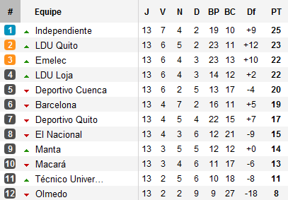 Trois points après treize journées : la première phase du championnat équatorien reste encore indécise. Double choc lors de la 13e journée disputée le week-end dernier avec les rencontres Emelec – Independiente et LDU – Barcelona.