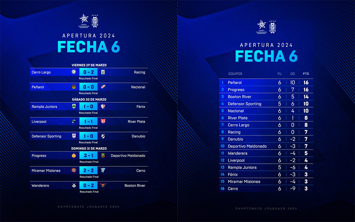 Pour le reste, Peñarol est co-leader du championnat avec la surprise Progreso. L’équipe sang et or est toujours invaincue avec une nouvelle victoire ce week-end contre le Deportivo Maldonado (3-1). À ce rythme, l’équipe pourrait rapidement envisager une petite coupe de tournoi court, l’Apertura, car ses adversaires vont maintenant aussi jouer en milieu de semaine la Libertadores ou la Sudamericana. La journée était composée de deux autres chocs, le pseudo-clásico Defensor - Danubio et Liverpool - River Plate. À domicile, le champion en titre a enchaîné son sixième match sans victoire (1-1) avec une égalisation concédée dans les derniers instants. Le Defensor a, quant à lui, longtemps buté sur Mauro Goicoechea, avant que De Los Santos n’ouvre le score à l’heure de jeu sur une action à l’uruguayenne après dix contres involontaires du ballon dans la surface. Les Violets reviennent en haut de classement à la quatrième place.