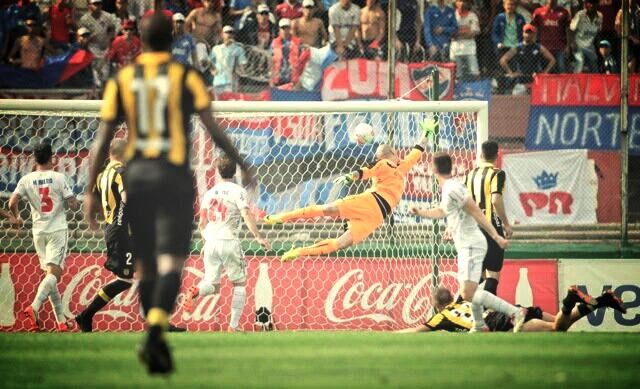 Malgré ces bonnes notes, le Clásico d’hier a été très classique... Match fermé, rugueux. Il faut dire que Munùa avait choisi une stratégie défensive, avec Eguren, Abero, Porras et Romero, cela fait presque quatre milieux défensifs dans l’équipe. Idem pour Bengoechea, qui a préféré remplacé Diogo par MacEachen, ne faisant pas confiance au repli défensif de son latéral face à un grand joueur comme Sebastian Fernandes. Le début du match est marqué par une légère domination du Nacional, mais aussi est surtout par une belle semelle de Forlán sur Porras. C’est le gros débat post-Clásico de cette semaine, puisque, selon certain, Cachavacha aurait dû recevoir un carton rouge. Il n’a eu que jaune, et cela me parait logique puisqu’il retire au dernier moment sa semelle, ne blessant pas Porras. A noter qu’hormis cette action « douteuse », l’arbitrage d’Andrés Cunha a été très bon. Dans la foulée, Ifran a un premier face à face avec Esteban Conde. Il reprend une magnifique transversale de Forlàn et tire à ras de terre, mais le gardien effectue un magnifique arrêt. Dans la foulée, Forlán se retrouve également seul face au gardien, et ce dernier arrête également le ballon du pied. Sur la première mi-temps, le gardien du Nacional est très bon et permet à son équipe de ne pas être derrière au score. Et à force de se manquer, Peñarol va lui-même subir des occasions. Tout d’abord sur un bon centre de Romero, Ivan Alonso ne peut reprendre le ballon de justesse. Dans la foulée, Piriz perd le ballon au milieu de terrain. Fernandez part en course sur le côté gauche, et sert Romero dans la demi-lune devant la surface. La frappe de ce dernier, qui était pourtant complétement arrêté, part violemment dans la lucarne de Gurruceaga qui ne peut strictement rien faire. L’ouverture du score est contre le cours du jeu, mais sur un but magnifique, qui vient récompenser le travail de Romero au milieu de terrain. A la 45éme, le Nacional a l’occasion de tuer le match, sur un centre de Porras, Alonso place sa tête, mais la balle vient taper le poteau opposé. Le bolso va regretter cette occasion en deuxième mi-temps.