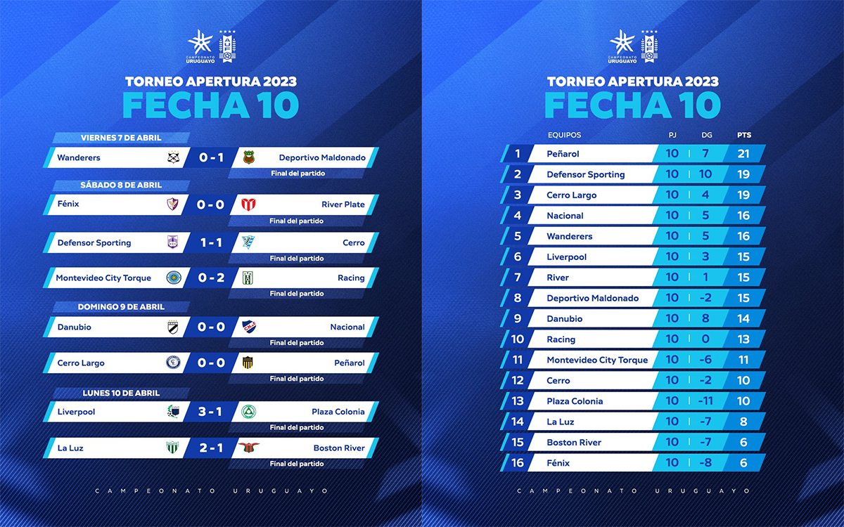 Pour le reste, Defensor a pris la deuxième place… en faisant match nul contre Cerro (1-1). Wanderers pouvait aussi faire un bond en avant mais l’équipe est sur une pente descendante et s’incline (1-0) contre le Deportivo Maldonado. En fin de classement, Racing réussit une très bonne performance en battant un Torque aux abois (2-0).