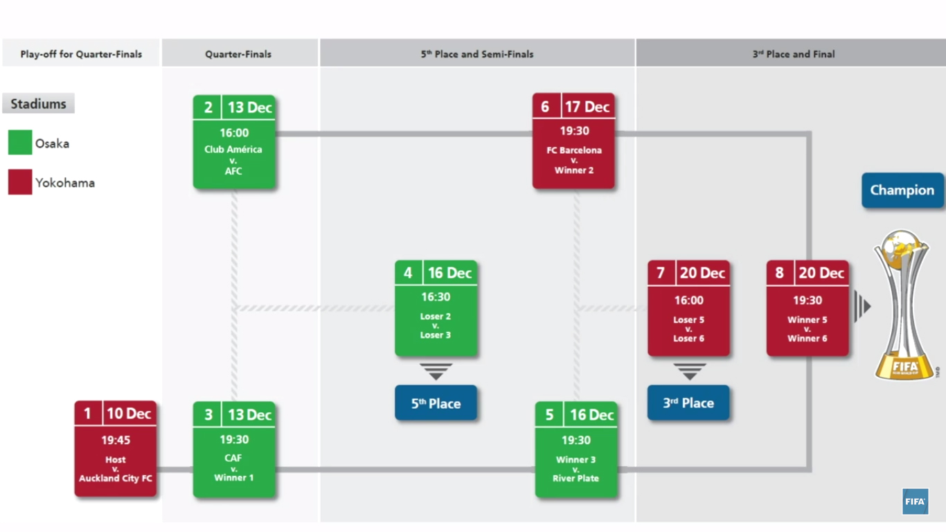 On connait ainsi les affiches de la 12ème Coupe du Monde des Clubs qui se déroulera au Japon du 10 au 20 décembre prochain. S’il reste encore beaucoup de participants à trouver (l’AFC Champions League, la CAF Champions League et le vainqueur de la J-league n’étant pas encore connus), la FIFA n’a pas souhaité attendre davantage et ainsi procédé au tirage au sort d’une compétition dans laquelle River Plate et Barcelone n’entreront qu’en demi-finale.