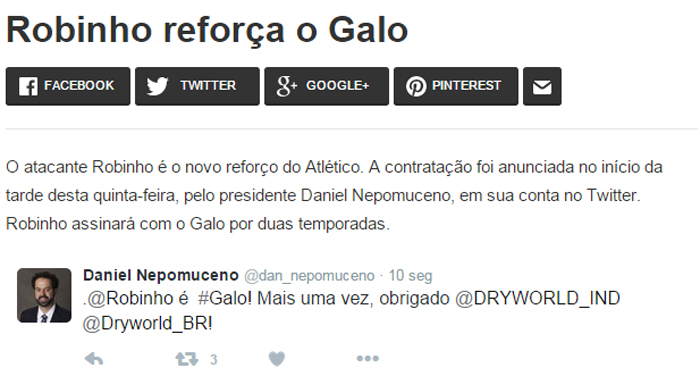 C’est par une courte annonce sur le site officiel que l’Atlético Mineiro a ainsi annoncé la signature de Robinho pour deux saisons. Après avoir déjà effectué un retour déjà peu réussi avec son club formateur Santos, l’ancienne star du Real et de Milan rentre donc au Brésil et disputera la Copa Libertadores dont le Galo sera l’un des outsiders. Robinho espère ainsi décrocher un trophée qui manque à son palmarès.