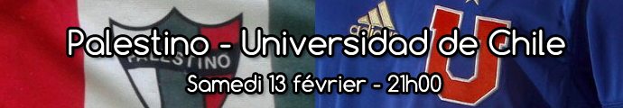 L'affiche de la soirée au Chili. Le Palestino de Córdova est quasi inarrêtable depuis la prise de fonction de ce dernier. Trois victoires un nul font de Palestino le second du championnat, peut être plus ce soir en cas de victoire. La U est mal en point. Elimination en libertadores, en manque de résultat en championnat, ils se retrouvent dos au mur.