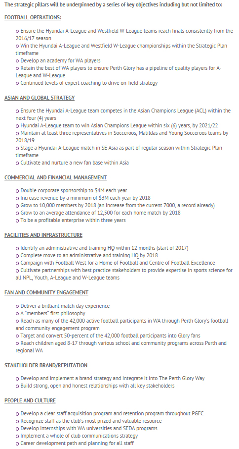 Nommé « The Perth Glory Way », le plan stratégique du club ce dévoile par une phrase : « Définie par un football passionnant, une cohésion avec les supporters, l’amélioration de la solidité financière et un engagement de parties prenantes du club : membres, fans et communauté de la région Western Australia ». Parmi la pléiade de mesures prises les plus importantes à retenir sont :