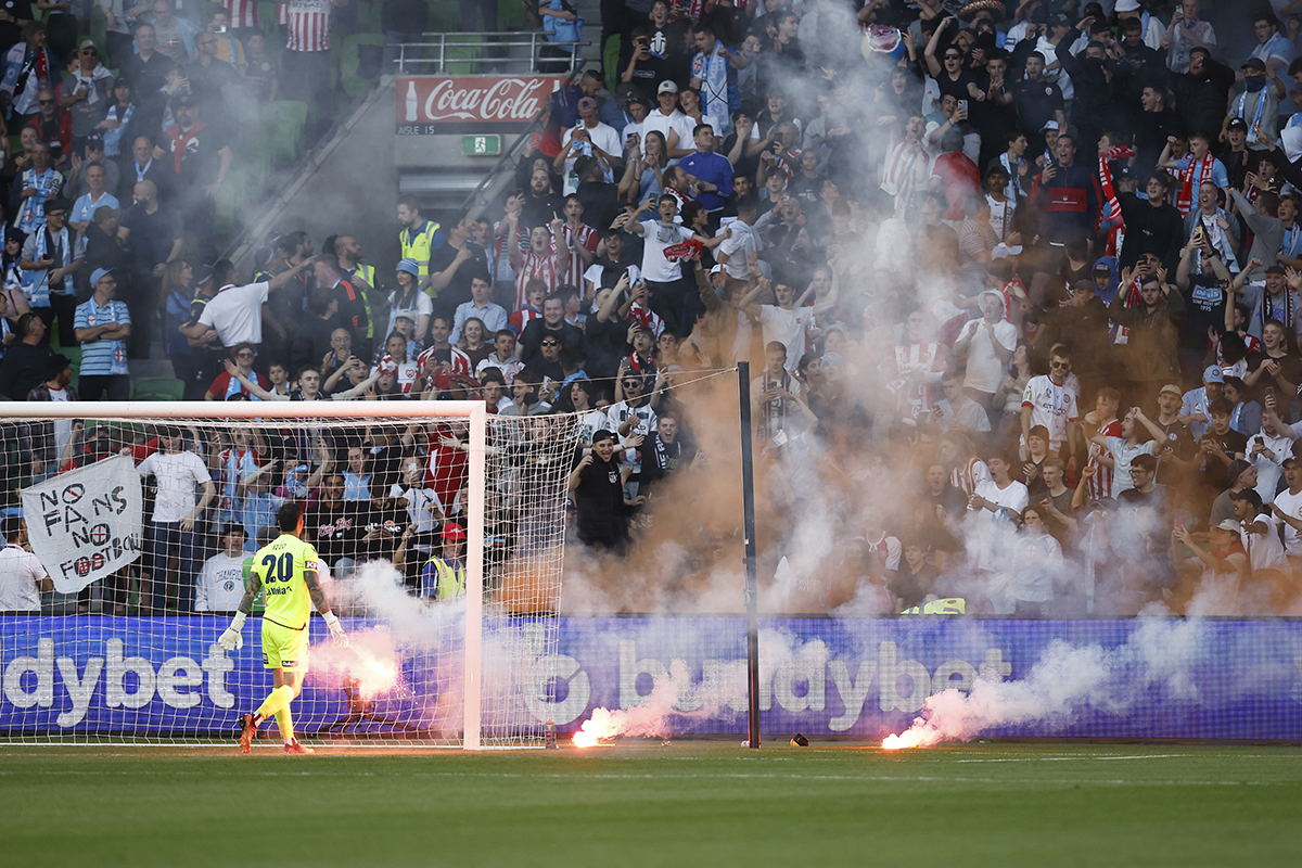 En protestation contre la gouvernance de la Ligue australienne, les supporters du Melbourne Victory s’en sont pris à Tom Glover, gardien de Melbourne City et de l’arbitre central dans le derby de Melbourne.
