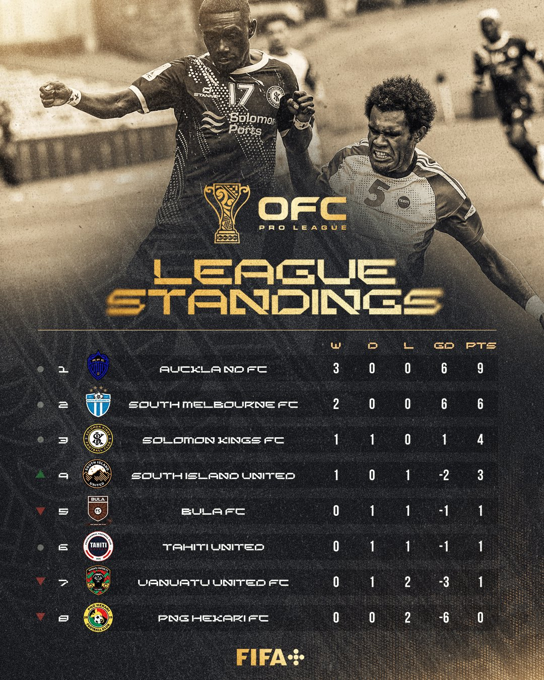 Si Auckland et Melbourne brillent par leur attaque, les Solomon Kings ont construit leur début de campagne sur une assise défensive de fer. Ils complètent le podium avec quatre points. Leur gardien, Philip Mango, est le grand artisan de cette solidité : il est le seul portier du circuit à avoir conservé sa cage inviolée à deux reprises. D'abord victorieux sur la plus petite des marges face à Hekari (1-0) grâce à Higashide, les Kings ont ensuite verrouillé un match nul et vierge face à Tahiti United.
