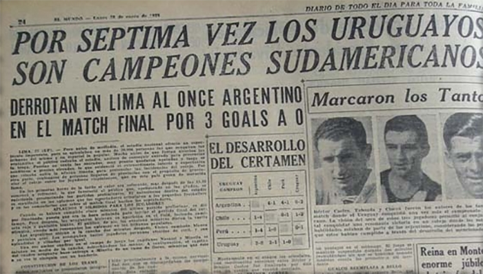 Six après la dernière édition, le Campeonato Sudamericano va enfin renaître de ses cendres sous l’impulsion du Pérou. Le pays fête le centenaire de la fondation de Nuestra Señora de Lima, la capitale, et veut en profiter pour accueillir le tournoi. La fédération péruvienne se montre alors efficace, elle réussit à convaincre Argentine et Uruguay à y prendre part. Le tournoi débute le 6 janvier, ils ne sont que quatre engagés, le Chili complétant le casting. C’est un tournoi spécial par le fait qu’aucun trophée ne sera remis et qu’il sert de prétexte à une qualification olympique (pour les deux finalistes). L’Uruguay rejoint le Pérou au terme d’un voyage de 9 jours, débuté le 24 décembre, à travers l’Argentine, passant par Buenos Aires, Mendoza, traversant la Cordillère des Andes pour arriver à Valparaiso d’où la délégation prendra le bateau pour arriver à El Callao puis à Lima. Rapidement, les deux favoris se détachent, l’Argentine écrase le Chili et le Pérou sur le même score (4-1) quand l’Uruguay s’impose dans la douleur face aux deux voisins du Pacifique (1-0 et 2-1). A égalité de points à l’heure du dernier match, ils se disputeront le titre.