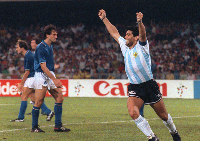 Forte de son deuxième titre en trois éditions, l’Argentine arrive en Italie en terrain conquis. Il faut dire que son meneur de jeu vient d’offrir un nouveau titre à son Napoli, il est chez lui, dans une Italie qu’il a mise à ses pieds. Mais Diego n’arrive pas dans les meilleures dispositions. Marqué physiquement par un championnat qui lui a laissé une cheville au volume doublé, touché par un ongle incarné qui l’oblige à jouer avec des crampons trop petits, miné par une hygiène de vie qui commence à défaillir, il va disputer toute la compétition sous infiltration, ne pourra alors pas peser comme il a pesé quatre ans plus tôt. Et avec lui, l’Argentine vacille.