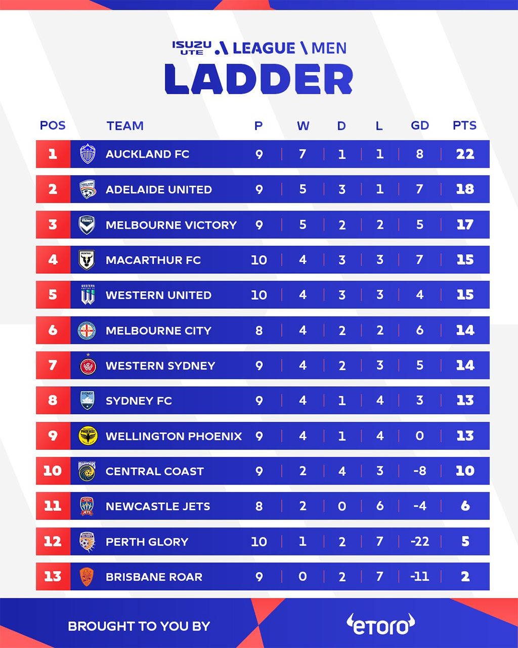 De leur côté, les Bulls, menés par Valère Germain, ont terminé l’année en beauté avec une victoire sans appel, 3-0, face à Perth Glory. Jed Drew a signé un doublé, tandis que Marin Jakolis a ajouté deux passes décisives à son compteur, portant son total à cinq cette saison. Pour Perth, en revanche, cette défaite confirme une année chaotique. Les départs s’enchaînent en coulisses avec Mustafa Amini, troisième joueur remercié depuis le début de la saison, quittant à son tour le navire. Western United continue quant à lui sa remontée spectaculaire au classement, passant de la dixième à la cinquième place en l’espace de quelques semaines. Unique équipe à avoir battu Auckland cette saison, WU a enchaîné avec une victoire minimaliste (1-0) contre Brisbane Roar à domicile. Pour les Roar, il faut remonter à avril 2024 pour retrouver une victoire en championnat, une série noire qui semble interminable et qui n’est pas près de s’arrêter.