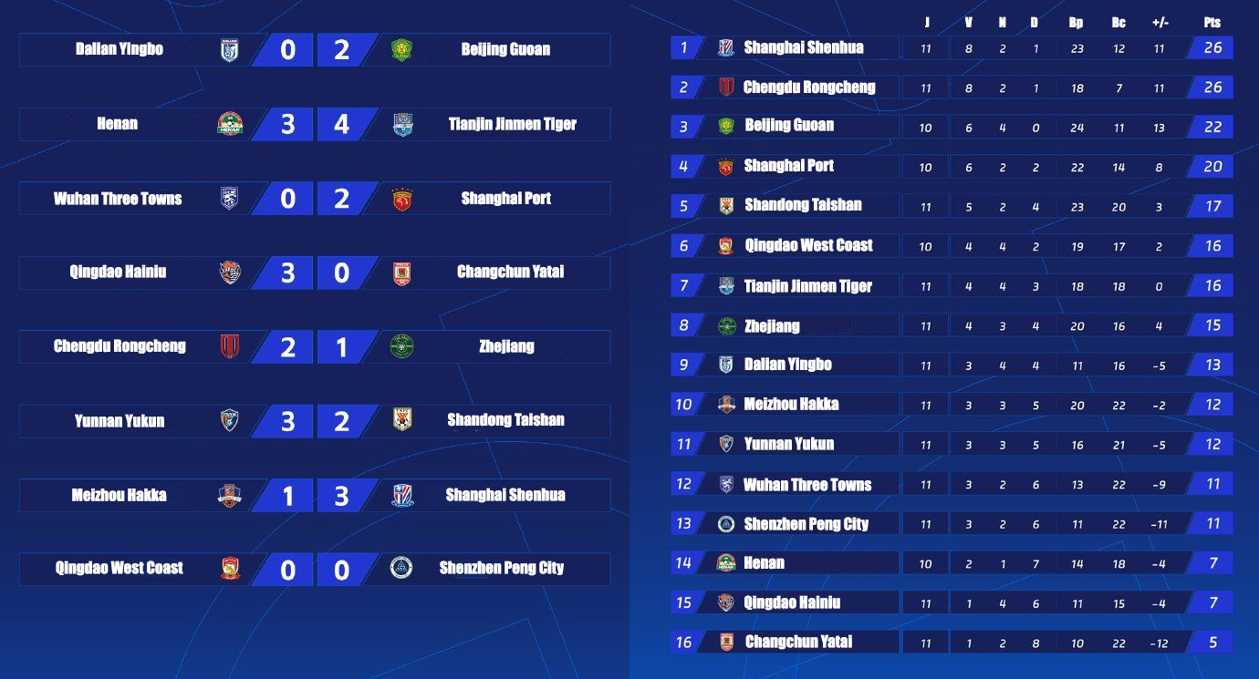Après cette onzième journée, toutes les équipes auront gagné un match cette saison. Au classement, seule une meilleure attaque permet au Shanghai Shenhua de repasser en tête du championnat devant le Chengdu Rongcheng (vingt-trois buts marqués par les Diables bleus, contre dix-huit pour la ville de l'hibiscus), bien que ces deux équipes se partagent le leadership avec vingt-six points chacun. Derrière, l'équipe de Quique Setién complète le podium, avec deux petites unités d'avance sur le Shanghai Port FC. En queue de peloton, le Qingdao Hainiu échange sa place de dernier de la classe avec le Changchun Yatai, qui (par-dessus le marché) cumule le triste privilège d'être à la fois la pire attaque et la pire défense du championnat (à égalité avec Meizhou, Wuhan et Shenzhen). Le déplacement sur le terrain du Henan FC dimanche prochain est déjà décisif dans la course au maintien pour les joueurs de Xie Hui.