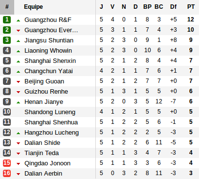 Car pendant ce temps, Dario Conca et les siens n'ont pu faire mieux que de sauver un point chez eux devant Guizhou Renhe mais parviennent à sauver leur seconde place au classement. Si le départ de l'édition 2012 semble plus compliqué pour le champion sortant, il reste cependant meilleur que celui de l'ensemble des autres favoris. Beijing peine à décoller en concédant le nul à Dalian alors que le Shenhua de Tigana, malgré un but de sa star française, concède le nul à Hangzhou. Quant à notre outsider, il occupe actuellement la dernière place du classement, cherchant désespérement un premier succès.