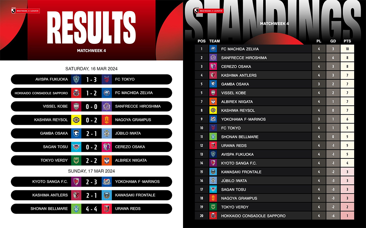 Machida leader surprise, les clubs d’Osaka enchaînent, Nagoya démarre enfin. Voici le bilan en cinq points de la quatrième journée de J1 League 2024.