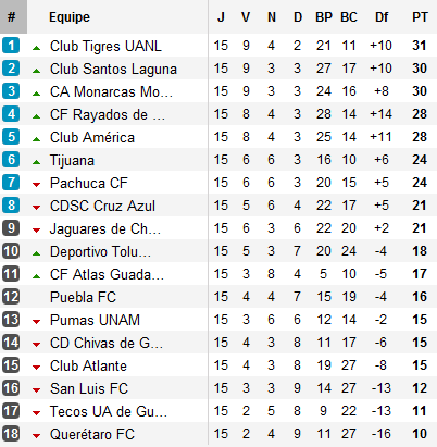 Avec le succès des Monarcas devant Pachuca, cela fait cinq équipes assurées de disputer la Liguilla. Il reste donc trois places à distribuer entre Tijuana, revenu avec un bon nul de Chiapas, l’un de ses concurrents directs, Pachuca, Cruz Azul, grand vainqueur de la semaine après son succès à Toluca et pourquoi pas Atlas. Six équipes pour trois places et 180 minutes à jouer.