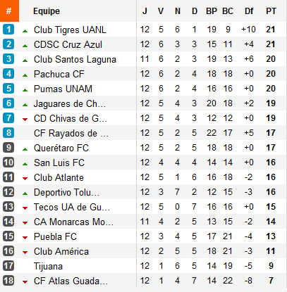 Ainsi, après avoir repris les commandes la semaine passée, les Pumas, balayés en 40 minutes par les Tigres allaient lourdement chuter au classement. De même, d’autres félins, les Jaguares, tombés à Pachuca et Chivas, accroché à Toluca, suivaient le mouvement. Trois places de perdues pour chacun et un nouveau trio de tête au sortir de la douzième journée.