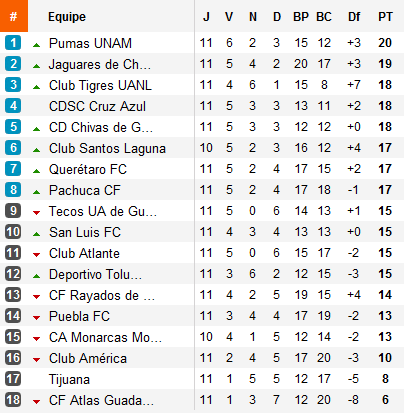 Reste que le championnat est toujours aussi serré, trois points séparant les huit premiers, actuels qualifiés pour la liguilla, et quatre points séparant les sept poursuivants directs à la huitième place. Dans ce groupe de poursuivants, Monterrey semble glisser au fil des journées. Accrochés chez eux par Toluca, les Rayados concèdent une quatrième rencontre sans succès et pourraient définitivement sombrer dans la crise si la tendance venait à se poursuivre.