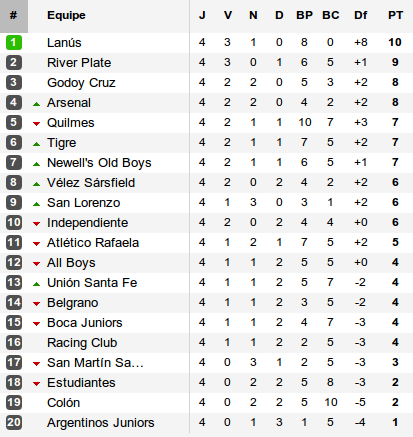 Après trois succès en autant de rencontre, la grande question de la quatrième journée était de savoir si Lanús et River allaient poursuivre leur sans-faute. Ce ne sera pas le cas. Toujours aussi solide, le Granate parvient à ramener un nul de son déplacement sur le terrain d’un Racing moyennement parti en ce début de tournoi alors que le Millo s’effondre au Nuevo Gasómetro de San Lorenzo. Conséquence, Lanús est désormais seul leader, River conserve sa seconde place. Car derrière, Godoy Cruz, Quilmes et Independiente n’en profitent pas. Le Tomba est neutralisé par Rafaela, les Cerveceros par Argentinos et le Rojo s’incline à Sarandi face à Arsenal, l’un des grands bénéficiaires de la quatrième journée qui revient ainsi à deux points du leader son futur adversaire.