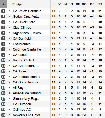 Car avec ses contre-performances, le classement se resserre comme jamais avec désormais huit équipes en quatre points. La belle affaire est donc pour Godoy Cruz qui parvient à s'imposer au Monumental et prend la seconde place du classement à un petit point de Vélez. Autre bénéficiaires, Banfield qui enfonce Newell's et Argentinos qui s'offre le Racing : le Taladro et les Bichos sont désormais à trois points de Vélez. Le week-end prochain s'annonce bouillant avec l'explosif Estudiantes – Vélez au menu pendant qu'en bas de tableau, Independiente (accroché ce week-end par All Boys) se déplacera à la Bombonera pour y affronter un Boca qui semble aller mieux (large succès à Huracán).