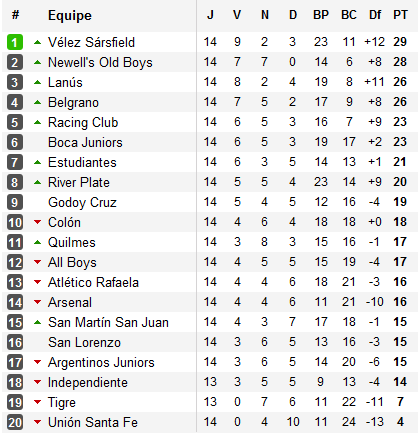 Une semaine après avoir cartonné Arsenal, Vélez a profité de la 14e journée pour prendre la tête du tournoi. Pour cela, le Fortin a signé un quatrième succès consécutif face à Godoy Cruz, grâce au doublé de Facundo Ferreyra, et profite du nouveau résultat nul de Newell’s (trois nuls en quatre matchs). Vélez prend donc un point d’avance sur la Lepra qui se rend à la Bombonera ce jeudi.