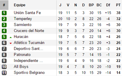 L’autre évènement du week-end est tout aussi historique. En décrochant le nul face à Unión, Sarmiento a également officialisé son accession à la Primera Division. Pour le Verde, il s’agit d’un retour après 32 ans d’absence et deux saisons passées alors dans l’élite du football local. Conséquence, il ne reste plus qu’une place à distribuer dans le groupe B et la lutte promet d’être intense. En s’imposant face à All Boys, Huracán reprend vie. Qualifié pour la prochaine Libertadores après sa victoire en Copa Argentina, le Globo se replace ainsi à hauteur de l’Atlético Tucumán et pourrait profiter de la dernière journée pour composter son billet. Car dans cette lutte acharnée pour l’accession, Santamarina aimerait bien venir coiffer tout le monde sur le fil. Opposé à Tucumán lors de l’ultime journée, les Aurinegros pourraient profiter d’un faux-pas du Globo au Duco face à Rivadavia pour prendre la cinquième place. En cas de succès de Tucumán et d’Huracán, il faudrait alors avoir recours à un match de barrage pour l’accession (ou desempate), dernière étape d’une course folle vers l’élite argentine.