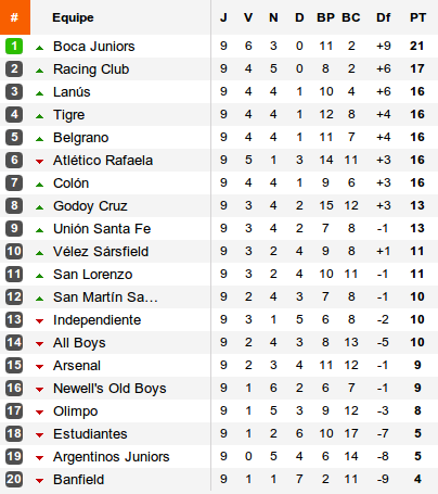 Heureusement pour Boca, derrière, tous les poursuivants coincent. Lanús et Colón se neutralisent, le Racing est accroché à San Lorenzo, Tigre sauve de justesse le nul devant All Boys alors que Rafaela tombe sur le terrain des verdinegros de San Martín, malgré le cinquième but du tournoi pour Darío Gandín, meilleur buteur de la ligue. Conséquence, la meute de poursuivant voit le Racing, à quatre points de Boca, mener un wagon de cinq équipes placées à une longueur, wagon rejoint cette semaine par un autre promu : Belgrano. Les piratas, à l'origine de la descente de River en juin dernier vient enterrer un autre géant, Estudiantes (victoire 3-2 remportée à dix contre onze) dont l'avenir à sa tête de Miguel Ángel Russo serait une question de jours.