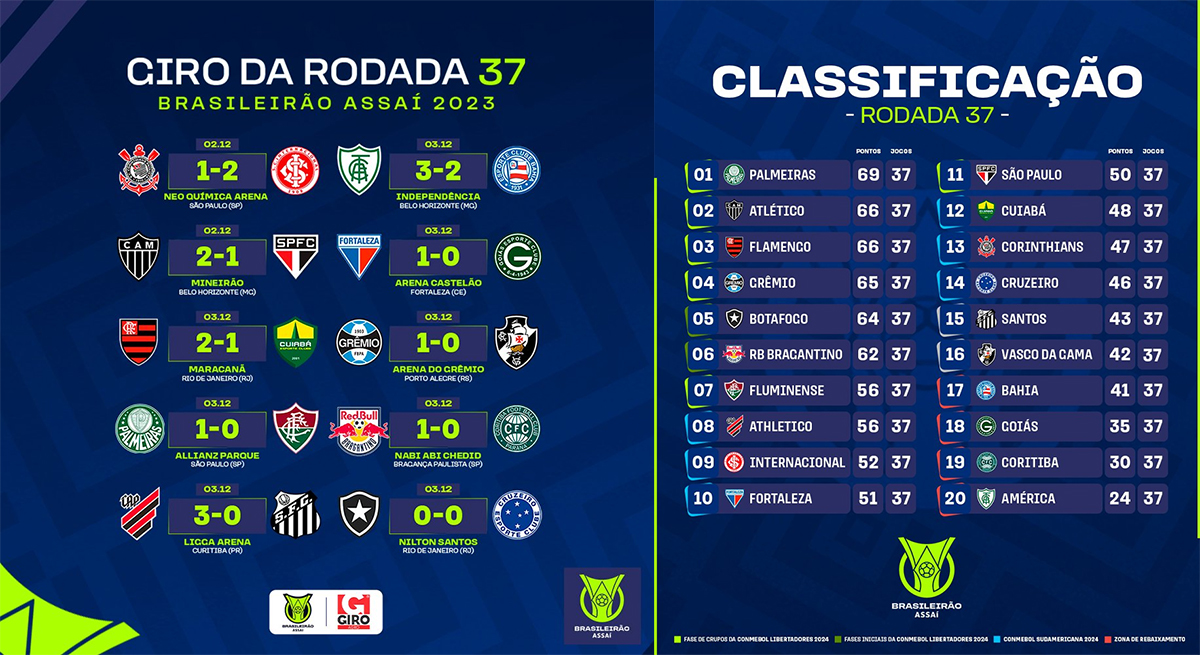 La trente-septième et avant-dernière journée du Brasileirão débute par un match entre le Corinthians et l’Internacional sans enjeu et finalement remporté par l’Inter. L’Atlético Mineiro maintient de son côté ses espoirs de titre en s’imposant dans les dernières minutes grâce à sa dupla Paulinho – Hulk, particulièrement efficace cette saison. Paulinho marque son dix-neuvième but dans le Brasileirão et devrait terminer meilleur buteur du championnat.