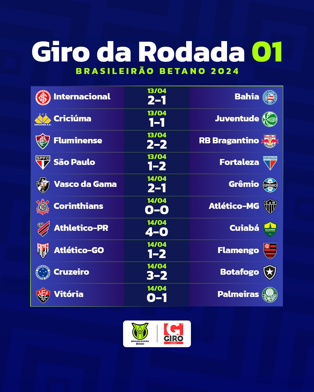 Pour cette première journée, les favoris Flamengo et Palmeiras repartent de leur déplacement avec la victoire alors que l’Athletico Paranaense est le premier leader du championnat.