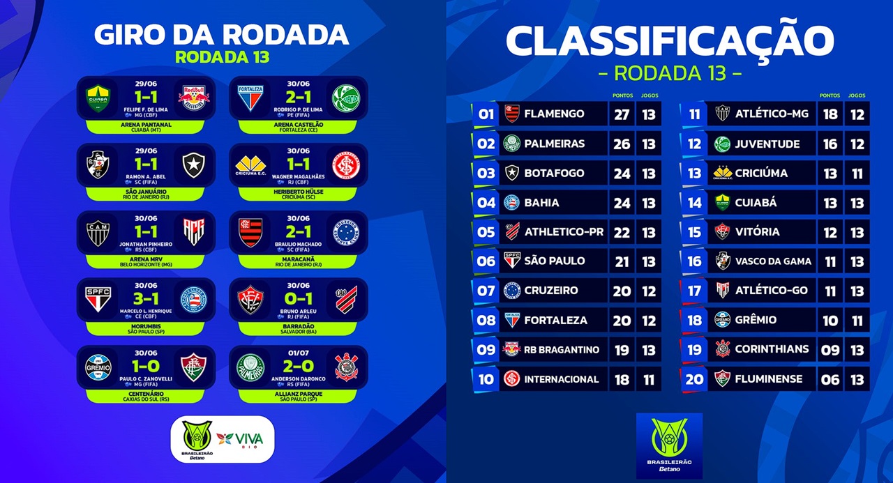 La treizième journée du Brasileirão débute par un clássico carioca, Vegetti répond au but de la tête de Bastos, Vasco et Botafogo se quittent dos à dos au São Januário. Dans le même temps, Cuiabá enchaîne un troisième match nul consécutif, cette fois contre le Red Bull Bragantino, et reste en dehors de la zone de relégation. Le troisième match de la journée se termine également sur un 1-1 qui ne fait les affaires de personne, l’Atlético-GO reste dans le Z-4 alors que l’Atlético Mineiro perd une place et est désormais dans la deuxième partie de tableau.