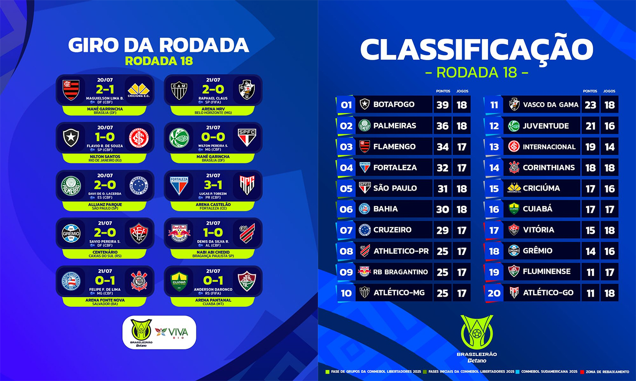 La dix-huitième journée du Brasileirão débutait au stade Mané Garrincha avec un match entre Flamengo et Criciúma, qui crée la surprise à la mi-temps en prenant un but d’avance. Flamengo s’impose finalement dans la douleur grâce au neuvième but de l’artilheiro du championnat, Pedro, puis un but sur un penalty insolite transformé par Gabigol en toute fin de match. Le leader reste cependant Botafogo qui, grâce à un but de Tiquinho Soares, bat l’Internacional sur la plus petite des marges et enchaîne un cinquième succès consécutif dans le championnat ! Après avoir perdu le championnat de façon dramatique l’an dernier, le Fogão peut à nouveau croire à un titre qui lui échappe depuis 1995. Entre les deux clubs cariocas, on retrouve au classement Palmeiras, qui pour la première de Felipe Anderson en tant que titulaire, bat le Cruzeiro de Cássio par deux buts d’écart. Le Verdão est à trois points de Botafogo et rêve d’un tricampeonato qui n’a été réalisé qu’à une seule reprise au Brésil, par São Paulo entre 2006 et 2008.