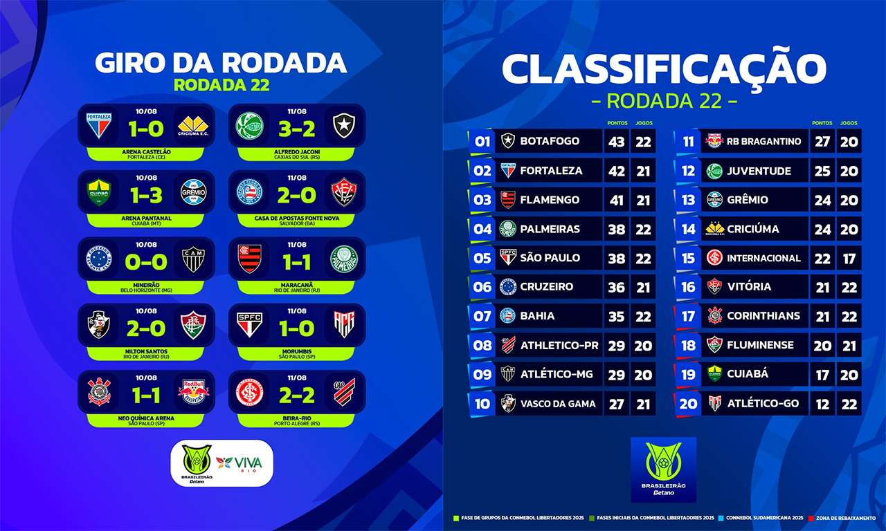 La vingt-deuxième journée confirme la très bonne forme de Fortaleza, qui décroche un septième succès sur les huit derniers matchs du championnat en battant Criciúma sur la plus petite des marges. Toujours invaincu à domicile dans le Brasileirão, Fortaleza conforte sa place dans le G-4 et met la pression sur les favoris au titre.
