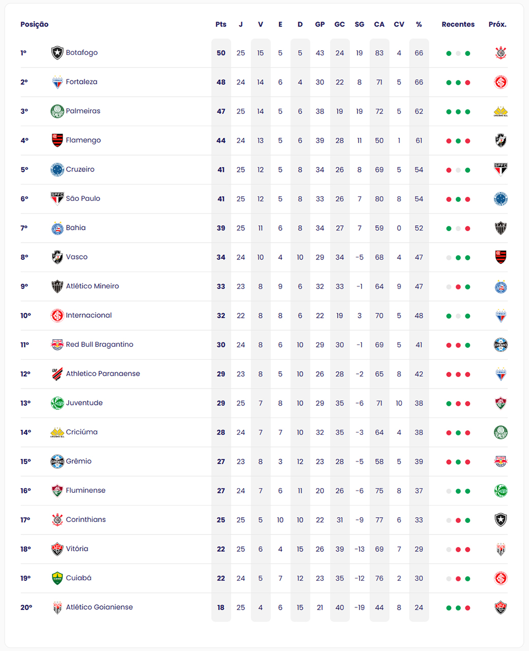 Palmeiras profite également du cadeau d’un adversaire pour s’imposer 1-0 face à un autre club carioca, Vasco, dans un match délocalisé au stade Mané Garrincha, alors que Fortaleza écrase Bahia sur le score de 4-1 et reste troisième du championnat. Ça cale en revanche dans la suite du classement, Flamengo aligne ses remplaçants en prévision du match de Copa Libertadores et s’incline 3-2 à l’Arena do Grêmio. São Paulo fait le même choix de faire jouer les réservistes pour un résultat similaire : malgré l’ouverture du score de Luciano en début de match, le Tricolor s’incline 3-1 au Morumbi contre l’Internacional.