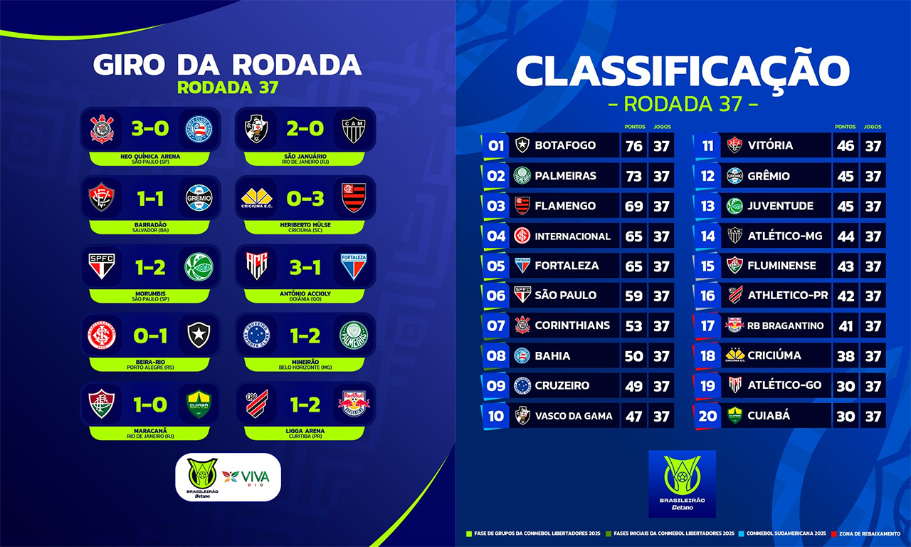 La trente-septième journée pouvait voir le sacre de Botafogo, qui n’a plus remporté le Brasileirão depuis 1995. Pour ce faire, Botafogo devait battre l’Internacional et compter dans le même temps sur une contre-performance de Palmeiras. Et le Fogão a longtemps cru tenir ce titre, Jefferson Savarino marquant le seul but de la rencontre au Beira-Rio dès les premières minutes du match. Mené 1-0 en seconde période, Palmeiras s’impose finalement 2-1 grâce à un sublime coup franc à la dernière minute de son prodige Estêvão, désormais à treize buts en neuf passes décisives dans le championnat. Palmeiras retarde donc le titre de Botafogo, qui a trois points d’avance avant la dernière journée, à domicile face à São Paulo. Le Glorioso a désormais 90 % de chance de remporter le titre face à São Paulo, qui n’a plus rien à jouer et ne voudra sûrement pas aider le rival Palmeiras à remporter un troisième Brasileirão consécutif, exploit réalisé seulement par… le Tricolor entre 2006 et 2008.