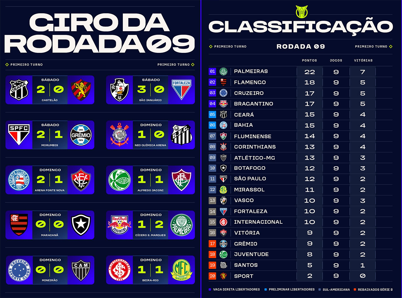 La neuvième journée débute avec une affiche du Nordeste entre Ceará et Sport. Lucas Mugni fait respecter la loi de l’ex et ouvre le score pour Ceará, qui confirme la victoire grâce à un but de Galeano en seconde période. Ceará est aux portes du G-4 alors que le promu Sport n’a toujours pas gagné dans ce Brasileirão 2025. Vasco, qui restait sur trois défaites consécutives, renoue avec la victoire en disposant largement de Fortaleza, notamment grâce à un doublé de Pablo Vegetti, qui rejoint de Arrascaeta en tête du classement des buteurs avec sept unités. Roi des matchs nuls en ce début de Brasileirão, São Paulo retrouve également le chemin de la victoire au Morumbi. Mené 1-0 à la mi-temps contre Grêmio, le Tricolor paulista s’impose finalement 2-1, comptant sur un penalty en fin de match d’André Silva.