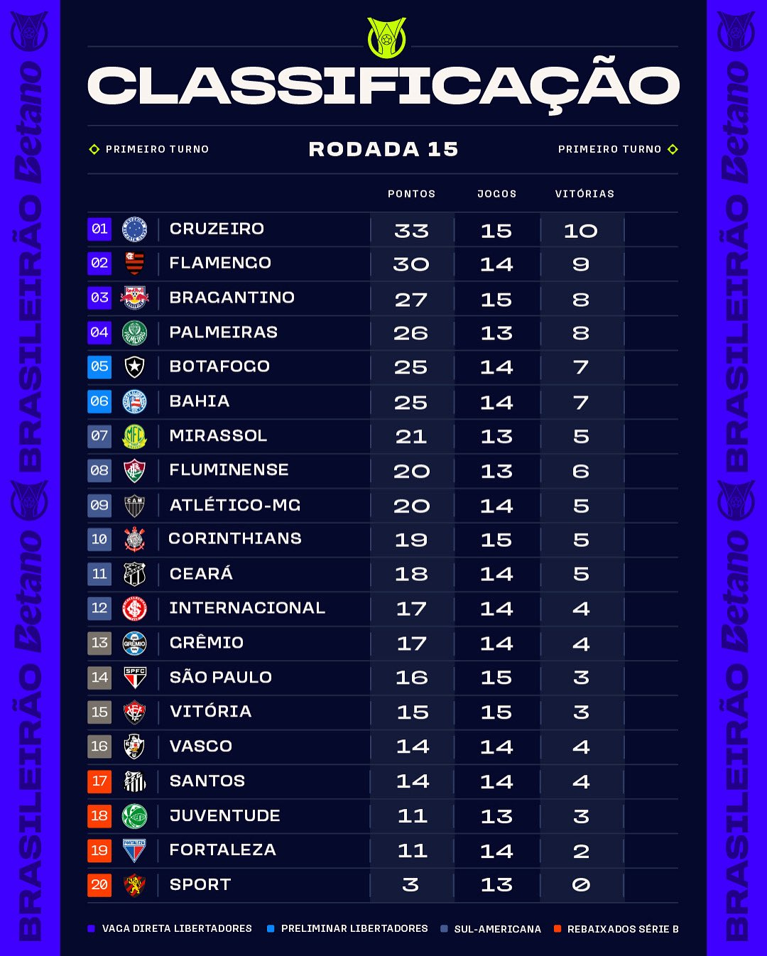 Tout en haut du classement, Cruzeiro continue de séduire en disposant largement de Juventude. Le meilleur buteur du championnat, Kaio Jorge, s’est cette fois mué en passeur avec deux passes décisives alors que Gabigol a inscrit un doublé, une première pour lui dans le Brasileirão depuis près de trois ans. Les hommes de Leonardo Jardim s’imposent comme un candidat crédible au titre alors que dans le G-4, le Red Bull Bragantino cède du terrain en s’inclinant sur la pelouse de Vitória. Le G-4 est complété par Palmeiras, qui a résisté au somptueux doublé sur coup franc de Hulk pour venir à bout de l’Atlético Mineiro.