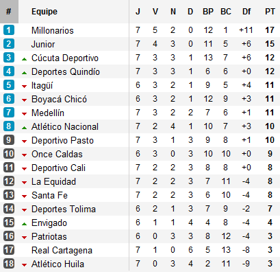 Car dans le même temps, le Deportes Quindio était accroché par La Equidad alors que Boyacá Chicó et Itagüí voyaient leur duel remis au 20 septembre prochain. L’aute grand gagnant de la semaine est donc Cúcuta Deportivo qui atomise Once Caldas et s’empare de la troisième place, à trois points de Junior.