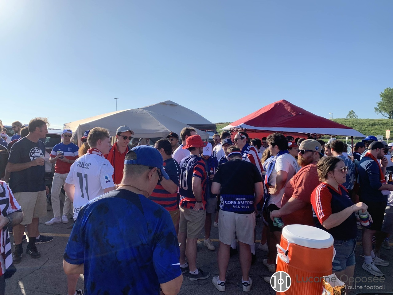 Pour se rendre au stade, éloigné de plusieurs kilomètres du centre-ville, nous devrons nous résoudre à utiliser la voiture faute d’alternative. À notre arrivée, nous prenosns part à l’une des traditions américaines des avant-matchs : le tailgate. Une tradition qui veut que l’on amène son barbecue, ses boissons alcoolisées ou non. C’est une sorte de pique-nique, mais à taille américaine. C’est aussi l’occasion de discuter avec des fans de l’équipe américaine désabusés qui iront au stade avec une affiche « Berhalter Out » (Berhalter démission). Après la désillusion de la défaite contre Panamá quelque jours plus tôt. Les joueurs américains se devaient de gagner contre la Celeste pour espérer une qualification en quarts de finale. Le décor était planté, le match s’annonçait tendu.